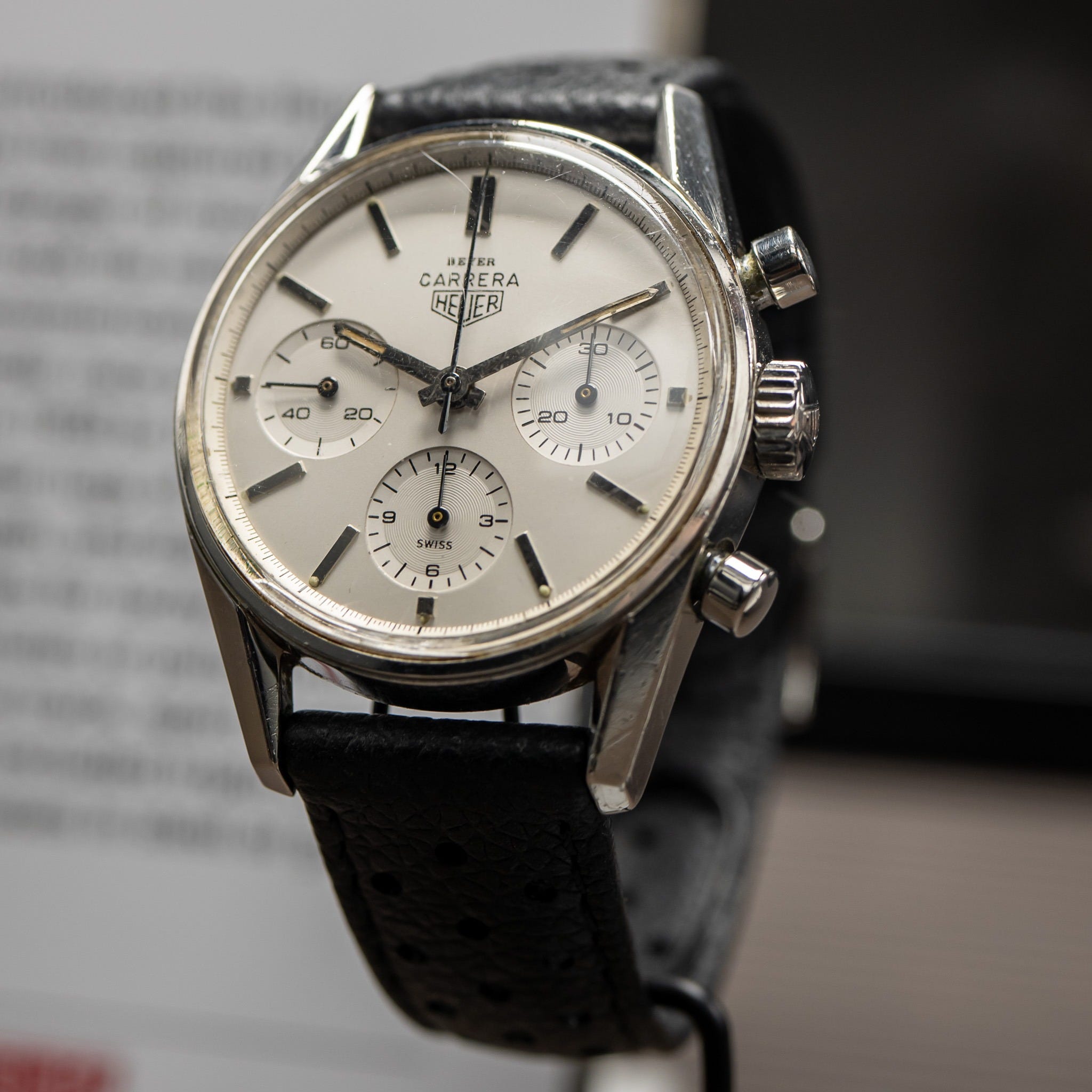 While most manual Carreras have a standard silver dial, very early examples can be seen with a matte “eggshell” dial, like this Beyer-signed ref. 2447, and it looks much better: