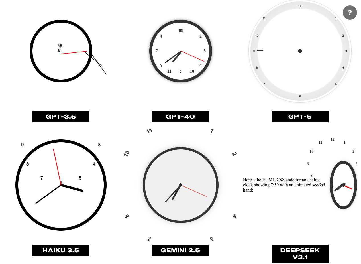 Good morning, and go Bears. It turns out AI kinda sucks at making clocks. This website prompts the large models to generate a clock for you. The catch: They’re not good. Part of the reason is thanks to the “10:10 problem”—most images of clocks and watches have the hands smiling at 10:10. For now at least, telling time is a very human thing: