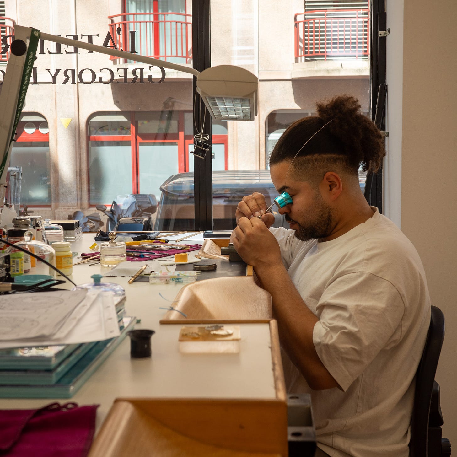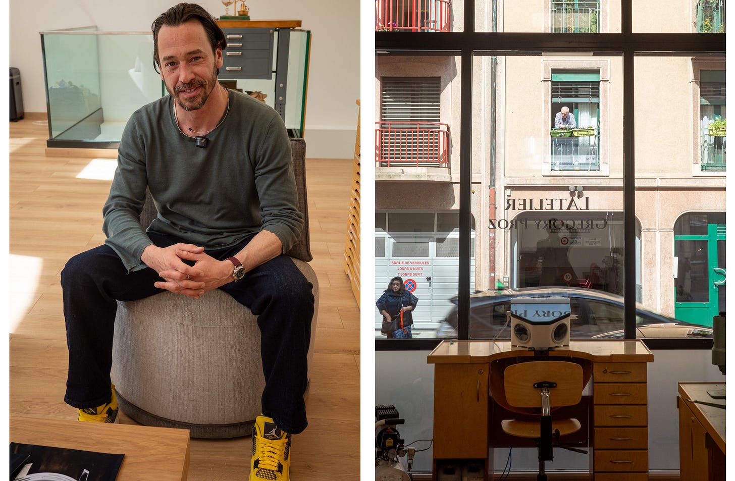 Proz was born and raised in Geneva. I briefly met his dad on the way in. He manages the theater at the Fairmont hotel, currently under renovation but usually home to the annual GPHG awards. A few of the old theater seats are sitting in Proz’s workshop, waiting for visitors. It feels fitting that Proz is one of the few watchmakers you’ll see working in the windows while walking through Geneva, along with Rexhep and Xhvedet Rexhepi.
