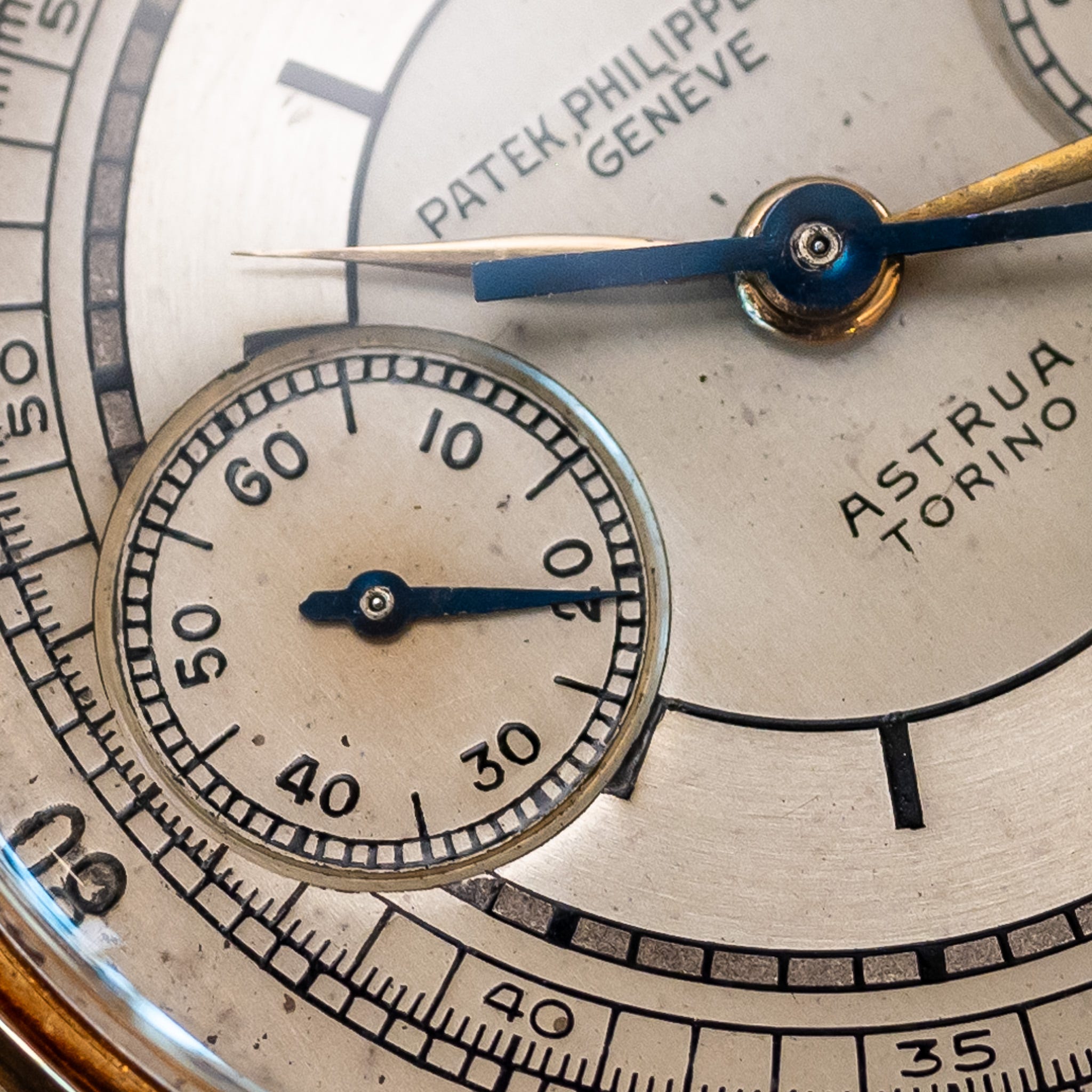 Soft-enamel touch-ups: Here’s a Patek chronograph ref. 130 with scales made using the engraved enamel technique. Zoom in on the tracks, and you can see that soft enamel has been applied in places over the original enamel during a restoration: