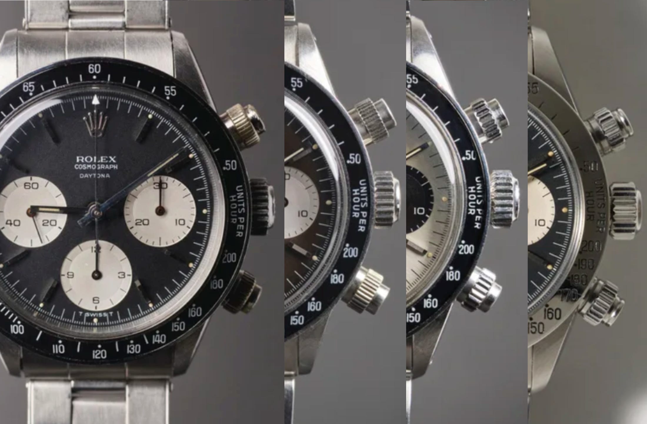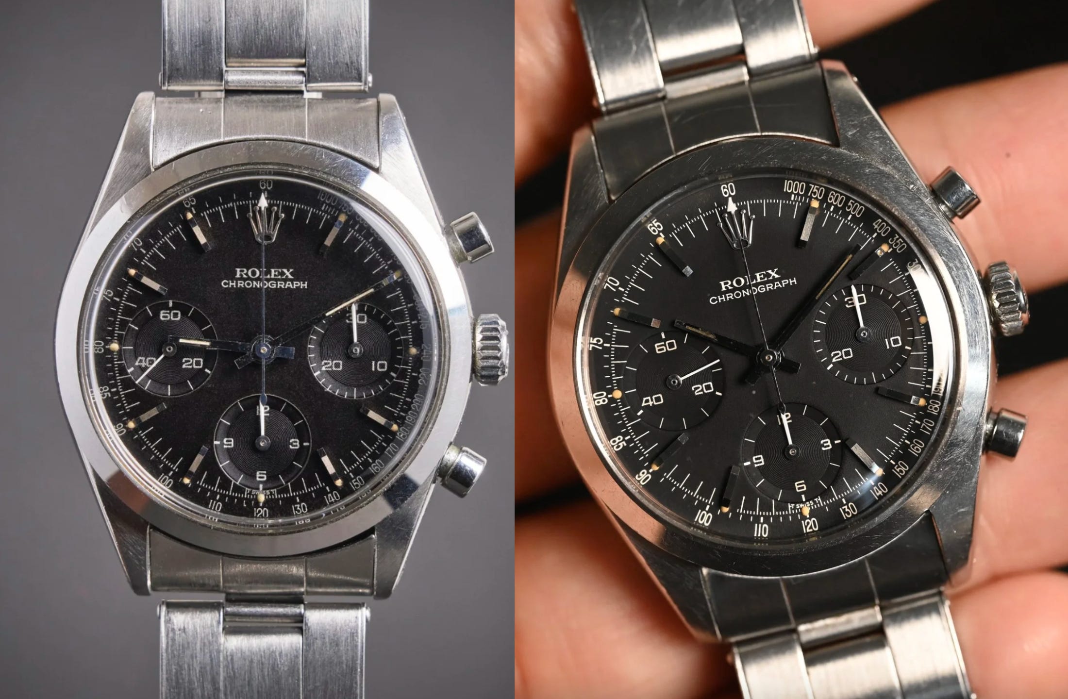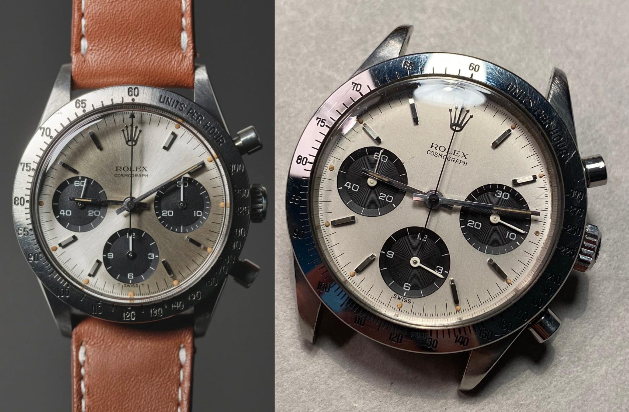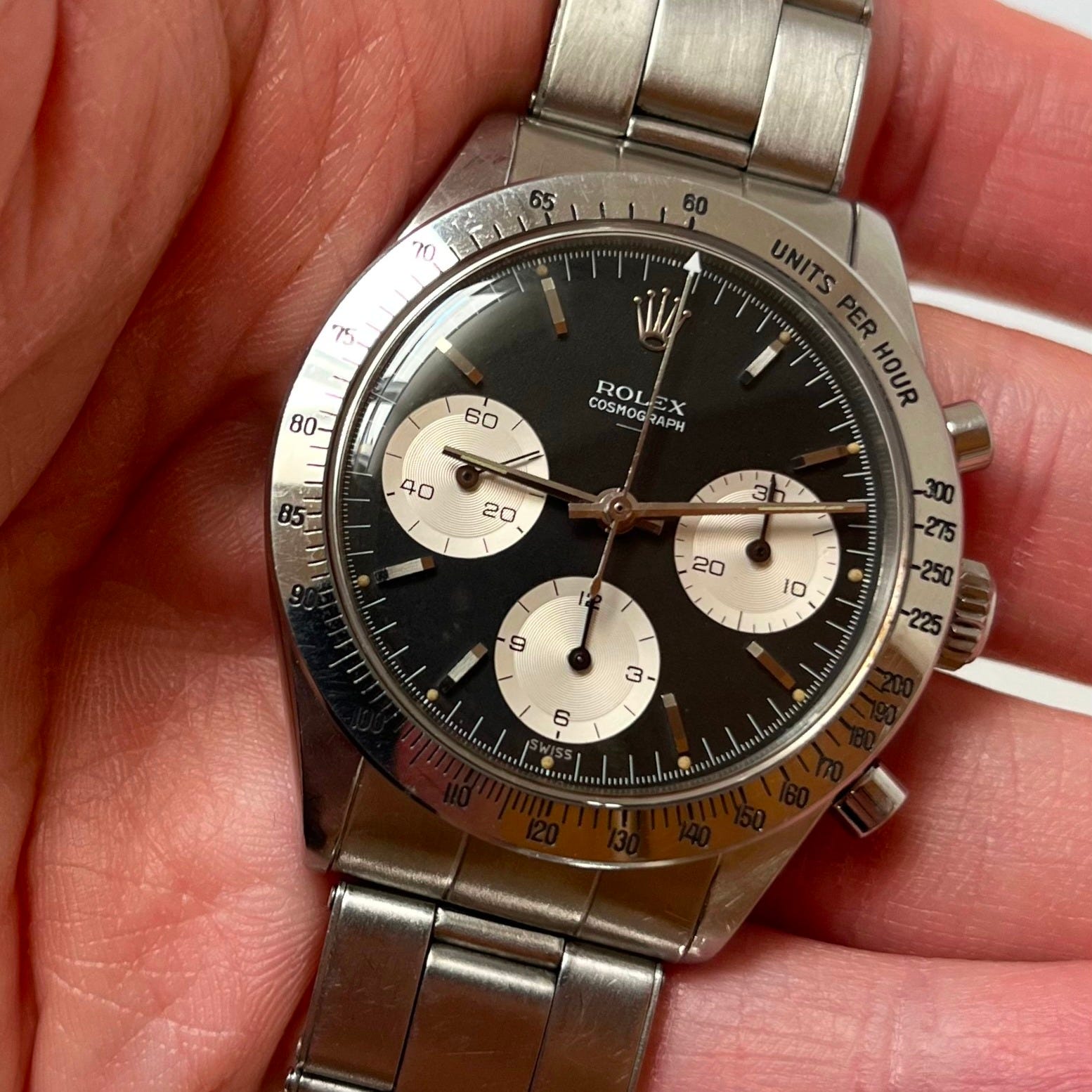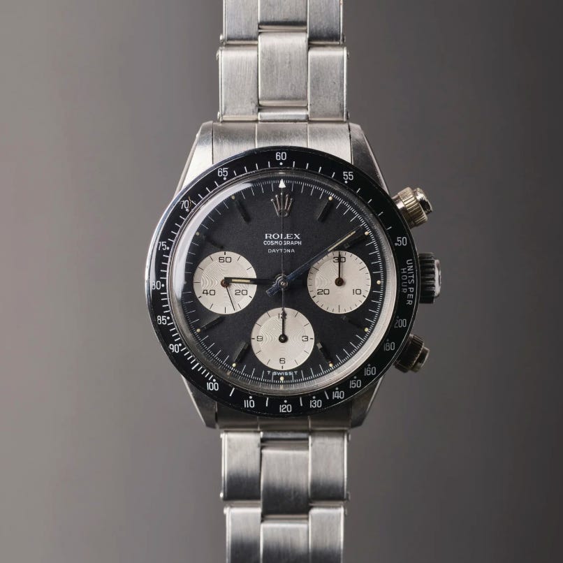 Period correct: As we discuss on the pod, the Daytona was one of the first truly collectible, mass-produced wristwatches. That means parts have been swapped, changed, and swapped again for the past ~30 years. It’s often hard to know if something is truly original. Often, the best you can do is learn what’s generally accepted as “period correct” for a specific reference and era: Matching serial number, pushers, and hands, along with a bracelet. It’s also important to remember that back in the day, it wasn’t exactly easy to sell a manual-wind chronograph. While there are patterns and accepted rules, always leave room for exceptions.