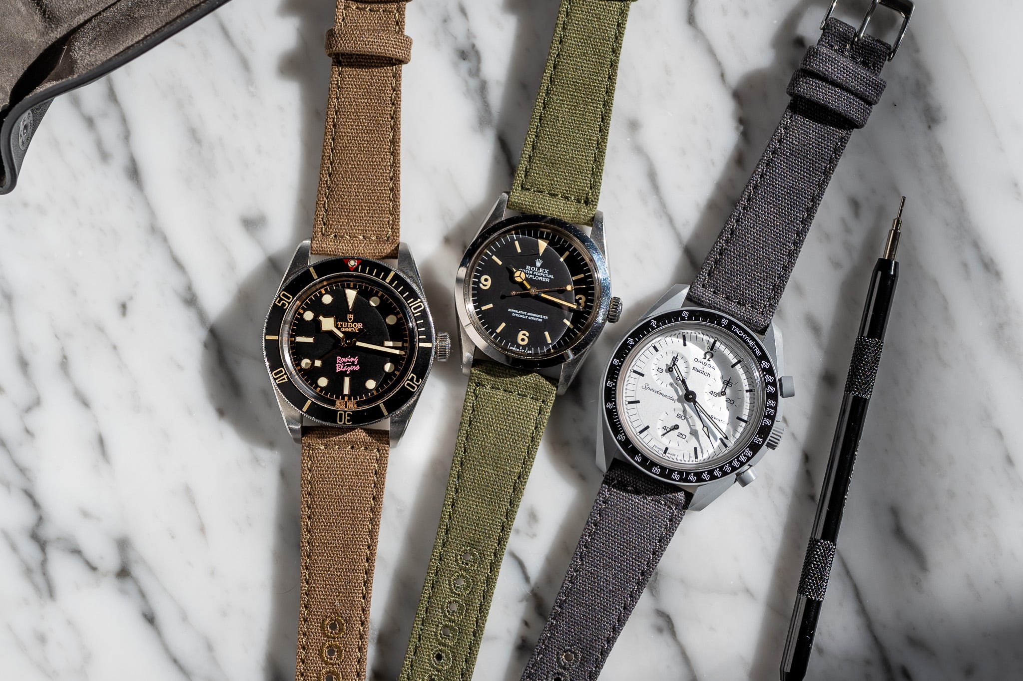 These canvas straps are the latest from strapmaker Nick Gabarro. If you’ve bought a vintage watch with a cool strap over the past decade or two, there’s a decent chance that strap came from him. He makes excellent leather—and now canvas—straps. He’s really excited about them, and I am too.