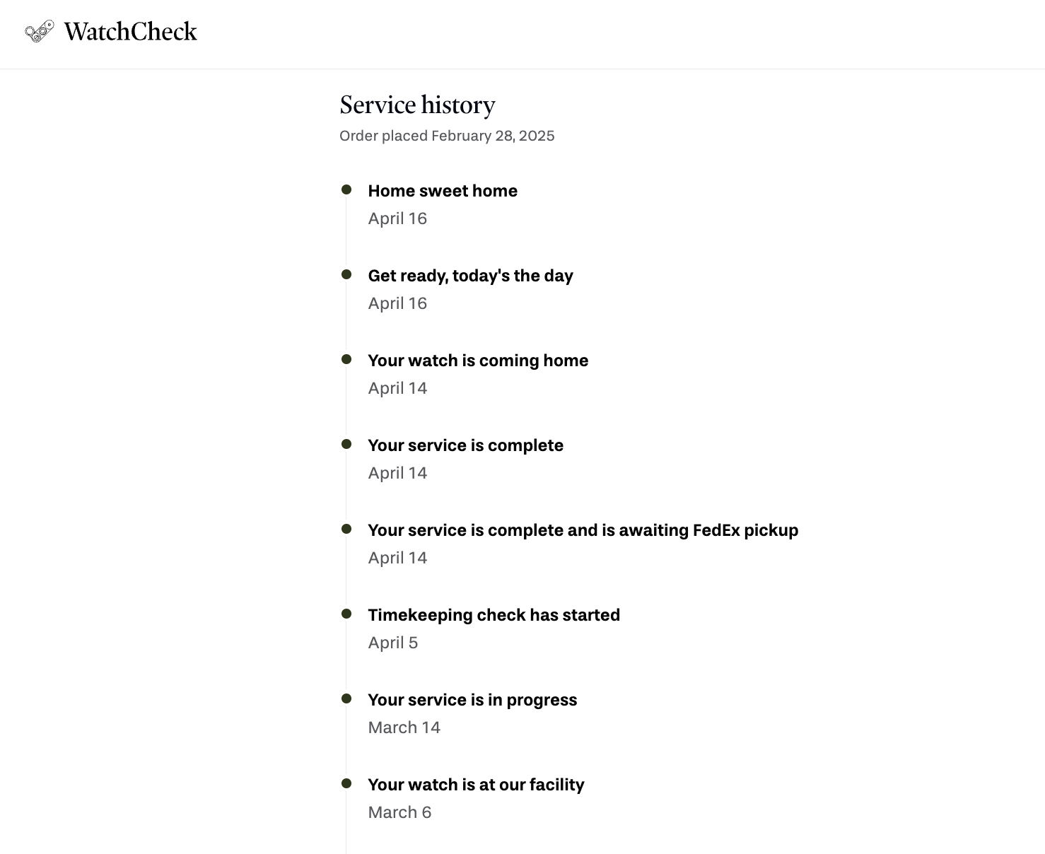It’s a seamless process: Watchcheck sends you a shipping kit that arrives at your door, which is then shipped (next-day UPS) to the service center. You upload photos for insurance purposes before shipping it off. The entire process took about six weeks, and I got email updates at every step: When the watch arrived, when service began, when timekeeping checks were performed, when it was shipped back to me.