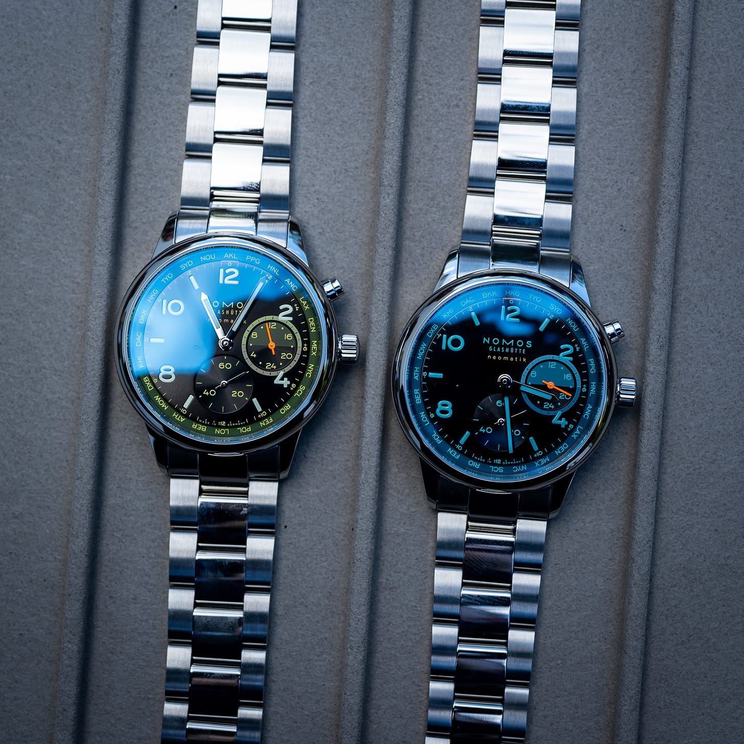 And of course, we have to mention the Nomos Club Sport World Timer again ($5k), now with three new colors: