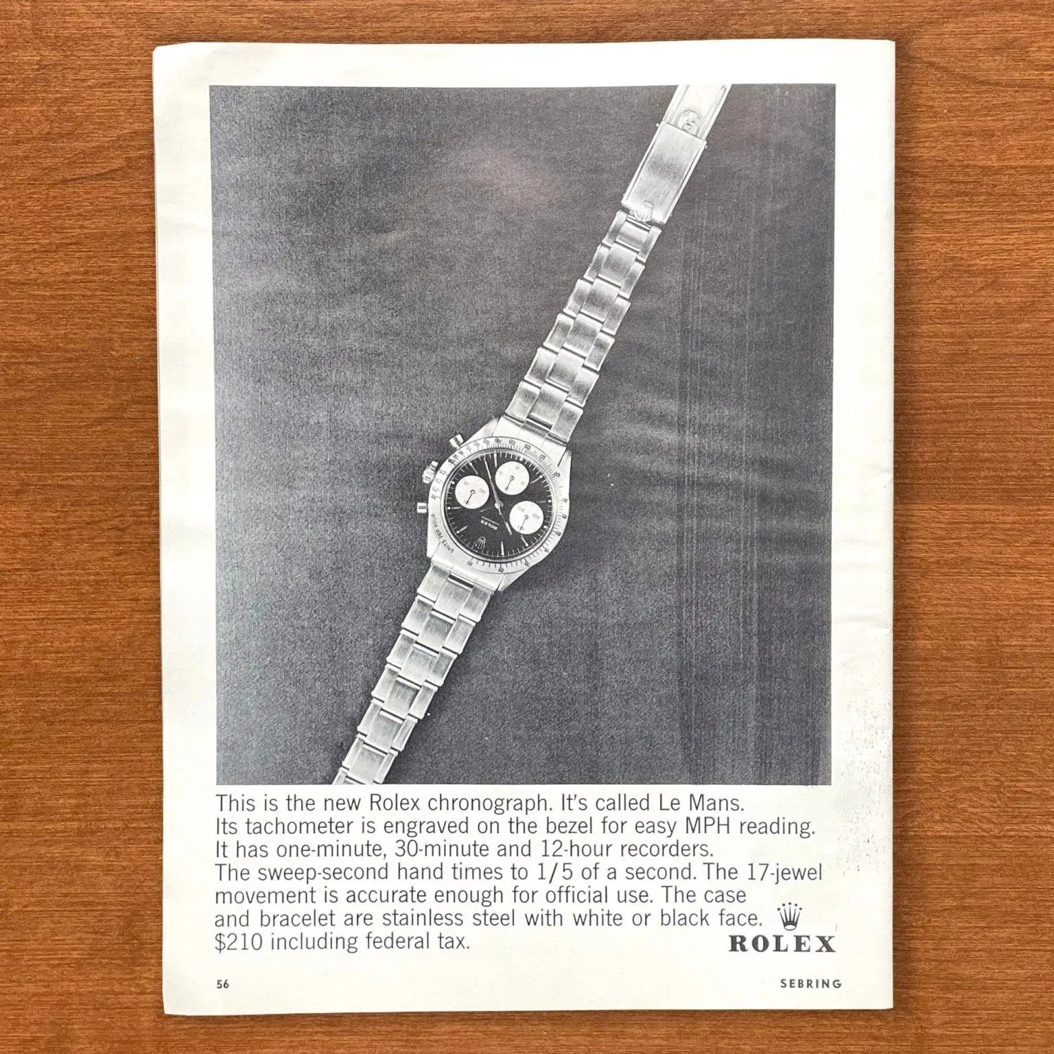 The first Rolex ‘Daytona’ ad ever. My buddy Nick of Ad Patina has the first Daytona ad ever, from 1964, in stock. It’s called Le Mans, the ad reads. While it features a ref. 6239, it shows how Rolex considered other names for its manually-wound chronograph before landing on the American-friendly “Daytona.” Nick said he only knows of four Rolex ads that show vintage, four-digit Daytonas, but this one is the first. Like anything first in collecting, it’s got the price tag to match: $1,795. So I texted Nick to ask how rare it really is. Here’s what he said: