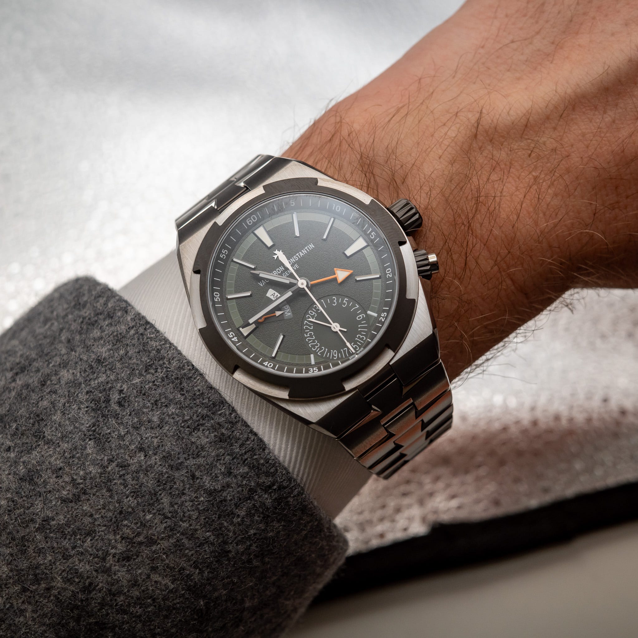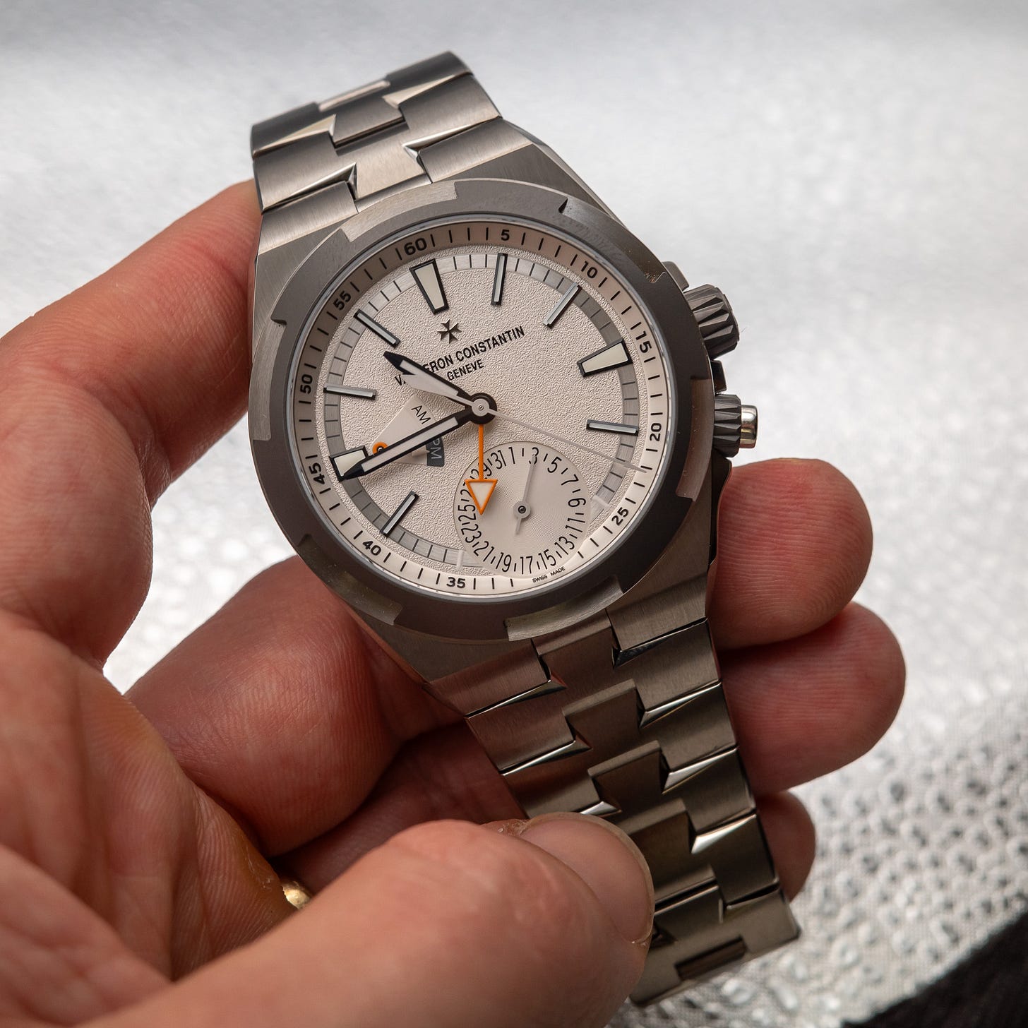 The Vacheron Constantin Dual Time in titanium, the follow-on to 2023’s “Everest Edition.” Available in four colors, the white is my favorite because you can see the textured dial best. It’s one of those watches that makes me wish I had a larger wrist (it’s 41mm), instead of wishing the watch were smaller. It makes sense at 41mm and looks great, just not on my wrist.