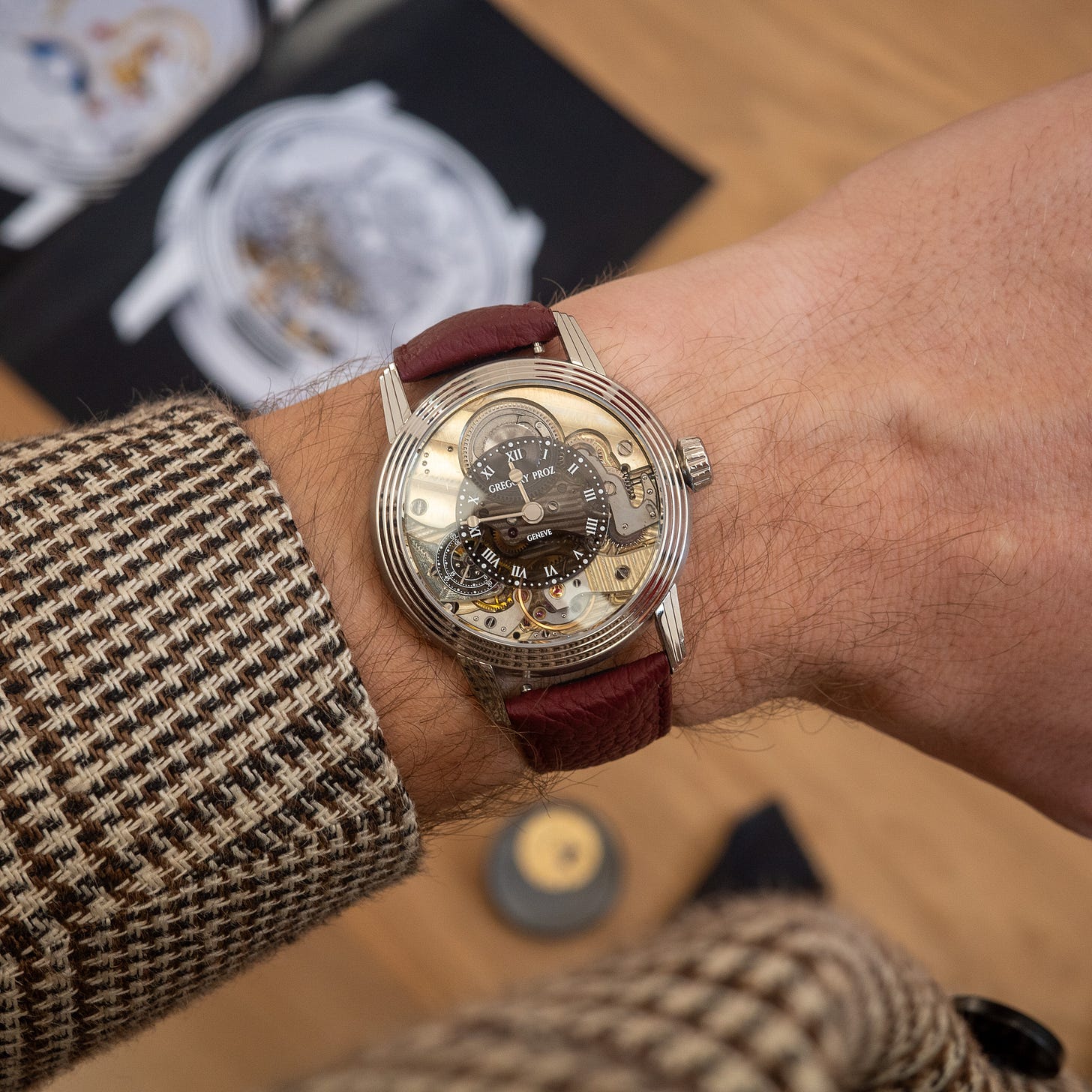 I also visited watchmaker Gregory Proz’s workshop, who’s working on his first project. This is an unfinished prototype, but he’s already got special editions in the works for Seddiqi and Hour Glass. Nicely sized, and the movement architecture is interesting.
