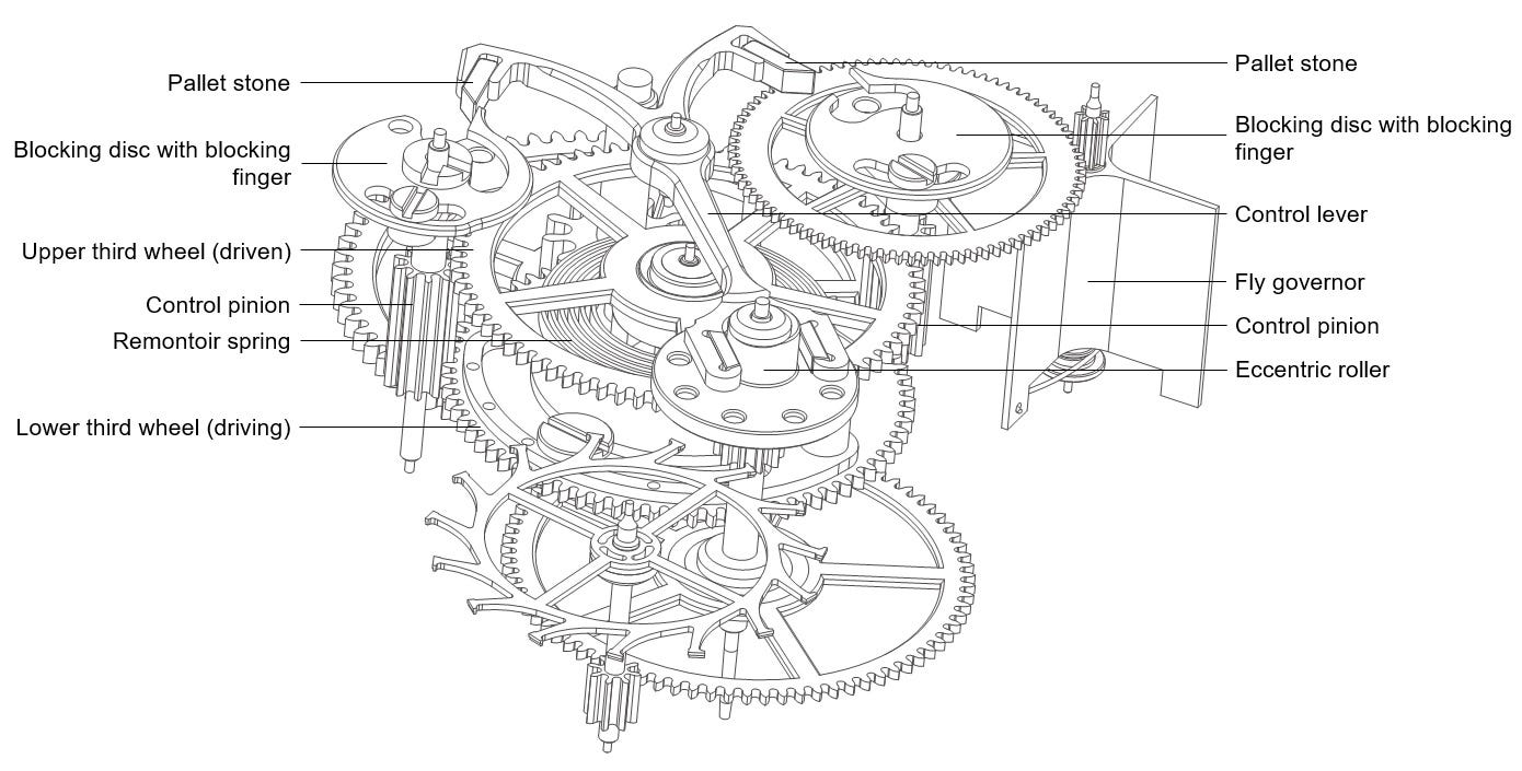Regulated release: A blocking mechanism with Y-shaped levers holds the remontoire in place until the seconds wheel rotates a roller once per minute, unlocking it for an instant.