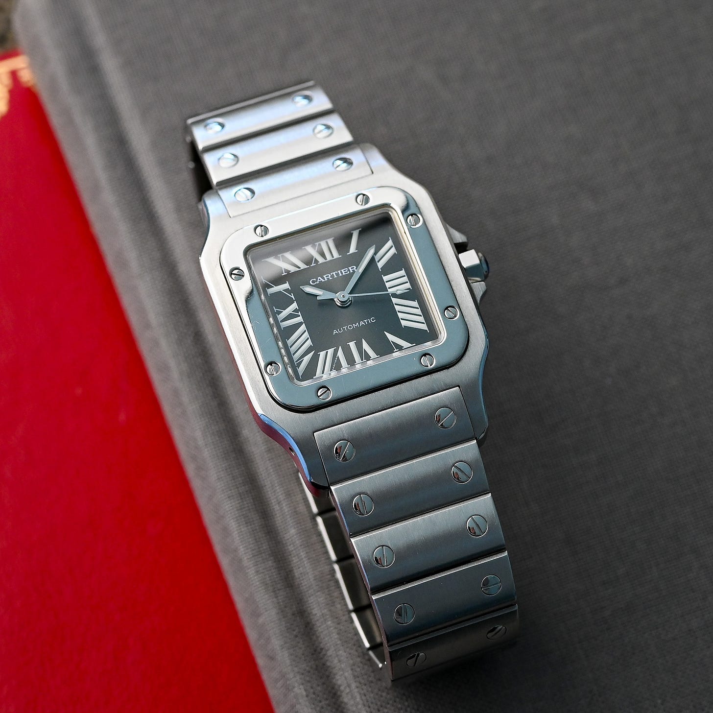 The Cartier Santos wears like a piece of jewelry. Cartier recently introduced a pair of new Santos models, one with a grey dial, the other in bead-blasted titanium. The modern, large Santos is just too big for me, but I thought I’d offer thoughts about having once owned a Santos.